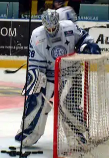 Eddie Läck (born 5 January 1988) is a Swedish former professional ice hockey coach and former player. He serves as an assistant head coach of the Arizona State Sun Devils. He also is currently a real estate agent in the Scottsdale Arizona region. [1]Läck, playing as goaltender, played in Sweden for Leksands IF of the HockeyAllsvenskan and Brynäs IF of the Elitserien before moving to the National Hockey League (NHL) where he played for the Vancouver Canucks, Carolina Hurricanes, Calgary Flames and New Jersey Devils. After going undrafted in the 2009 NHL Entry Draft, he signed as a free agent with the Vancouver Canucks in 2010. He was assigned to the Manitoba Moose in his first season with the Canucks organization and was named to the American Hockey League's 2010–11 All-Rookie Team. He is nicknamed "The Stork", in reference to his tall stature and long legs.[2]