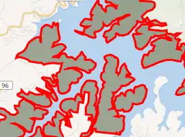The park is situated amidst rolling hills ("knobs") that comprise part of the geological boundary between the Eastern Highland Rim and the Central Basin. These hills are typically underlain by Mississippian period limestone, the erosion of which has created karst-like formations throughout the Center Hill Basin.[1] Outcroppings of this limestone are visible along the cliffs overlooking the lake.