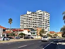Edgewater Towers is a high rise apartment block located in the suburb of St Kilda in Melbourne, Australia. The building, completed in 1961, was Melbourne's first, high rise residential apartment block[1] and the tallest in Victoria until Robin Boyd's Domain Park Flats was completed in 1962. The building was designed by émigré architect Mordechai Benshemesh who designed many multi-storey buildings in St Kilda, Victoria and Elwood, Victoria.[2] Edgewater Towers is considered to be Benshemesh's most iconic design.[3] Edgewater Towers stands at 44 m tall (architectural), 39 m tall (to the roof), and 13 stories tall.[4]
