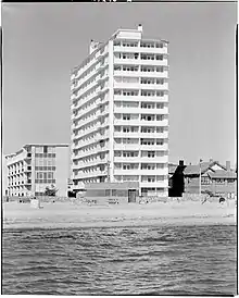 Edgewater Towers was the brainchild of property developer Bruce Small, of Malvern Star Bicycles fame, and later Mayor for Gold Coast, Queensland. The project was conceived as "own your own" luxury housing and marketed as "sophisticated living with beautiful views".[5] It was designed in 1959-60[6] and constructed in 1960-61. The project ran into financial difficulties and construction stopped after the lower floors were completed. It was sold for £500,000[7] and construction then resumed. A restaurant and lounge bar, which had been planned for the roof, did not eventuate.[8] Edgewater Towers was opened on 4 March 1961 by Sir Horace Petty,[9] the Minister for Housing (Victoria) and Immigration, who was an advocate for high density housing. The building is included in the City of Port Phillip's Heritage Review, which lists its significance as being "the first of St Kilda's residential high rise developments". The review also states "It still plays an important symbolic role in the perception of St Kilda's character and imagery". "Standing somewhat like a towering section of a stranded ocean liner, it announces St Kilda's uniquely nautical cosmopolitan zone at its southern approaches".[10] "Thirteen storeys high, with great views across the bay, Edgewater Towers was a confident expression of progress and, after a period of neglect, has re-emerged as an iconic expression of Melbourne post-war modernism".[3]