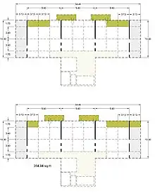 The residential block is supported by four bearing walls 9.40 meters apart, expressed on the office block by vertical glass mullions (4 red lines). These bearing walls allow for curtain wall construction: a non-loadbearing facade.[1] The structural module of 9.40 meters by 10.30 meters. The 9.40-meter dimension between walls is further subdivided into three modules of 3.13 meters ( 10'-3"), and this is the architectural dimension seen previously of all the bedrooms and living rooms.[1] There are eleven 3.15 meter subdivisions in total which make up the one-bedroom (6.30 meters) and two bedrooms (9.40 meters) apartments. The outermost 3.13 meters of slab at either end and on each floor, shown hatched on the structural plan diagram, is cantilevered and that is how Quintana achieves the thin walls at the ends of the apartment block (on the NE elevation), these walls only carry their own weight similar to the South and North walls of the United Nations Secretariat Building. They are the same thickness as the floor slabs. All outboard balconies are 5.34 meters long, all non-service rooms have access to balconies. The two basic floor plans of apartments alternate between the eighth floor and the twenty-third floor. The apartments on the seventh floor (the 1,449 sq m roof of the office block) had private gardens; the end wall of the residential block is missing and the residential block appears to float. (N.E. elevation). Unfortunately, the tenants of this apartment have added rooms so this subtle modernist detail has been lost.[1] These three units and their private gardens, overlooking Calle 23, were confiscated early in 1960 and the roof was turned into a children's playground; the playground was eventually closed.