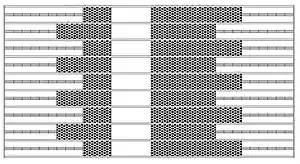 The 3.40 metres (11.2 ft) width of the rooms is further subdivided into three sections of 1.13 metres (3 ft 8 in) and this module determines the width of doors, windows, and passages between rooms within the apartment. The wooden windows have two sets of nine movable slats that can be independently controlled to modulate the natural light in the room, they can be completely closed to make the room totally dark, even in bright days. The pattern of the windows and door and the bearing walls (9.40 meters apart) are expressed on the Calle N elevation.