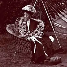 In the group photograph shown Begbie is on the left with Wilkinson in the centre and Macfarlane on the right. The child kneeling in front of the hammock is three year old Paul Lamartine Yates, the son of Rose Emma Lamartine Yates, the Organising Secretary and Treasurer of the Wimbledon branch of the WSPU and at whose home, Dorset Hall in Merton Park the photograph was taken in about 1912.[8] Begbie was the second-in-command of the WSPU branch at Wimbledon.[9]