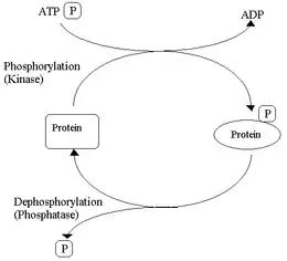 Explained simply reversible protein phosphorylation works like this: a protein kinase moves a phosphate group from adenosine triphosphate (ATP) to a protein. The shape and the function of the protein is altered enabling it to take part in converting glycogen into glucose which is used for fuel for muscular contractions. When the protein has completed its role a different protein phosphatase removes the phosphate and the protein reverts to its original state. This cycle takes place to control an enormous number of metabolic processes.[12][13]