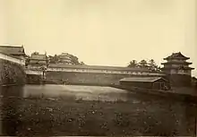 After the capitulation of the shogunate in 1867, the inhabitants and shōgun had to vacate the premises. The castle compound was renamed Tokyo Castle (東京城, Tōkei-jō)[7] in October, 1868, and then renamed Imperial Castle (皇城, Kōjō) in 1869. In the year Meiji 2 (1868), on the 23rd day of the 10th month of the Japanese calendar the emperor moved to Tokyo and Edo castle became an imperial palace.[8]