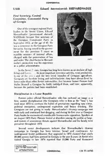 Previous Soviet Georgian rulers had given in to nationalist favouritism to the Georgians; Shevardnadze was against this policy of favouritism. Therefore, his nationalistic policy is considered controversial in Georgia.[23] At the 25th Congress of the Georgian Communist Party, Shevardnadze told the congress, "for Georgians, the sun rises not in the east, but in the north—in Russia".[24] Shevardnadze saw "extreme nationalism", coupled with corruption and inefficiencies within the system, as one of the main obstacles to economic growth. During his rule he condemned what he considered "national narrow-mindedness and isolation" and writers who published works with nationalistic overtones. The 1970s saw an increase in nationalistic tendencies in Georgian society. The 1978 Georgian demonstrations were sparked by the Soviet government's decision to amend the Georgian constitution and remove the Georgian language as the sole state language in the republic. While at first standing firm with the Soviet government, Shevardnadze quickly reiterated his position and was able to compromise with the Soviet government and the demonstrators. The Georgian language was kept as the sole official language of the republic and the Supreme Soviet of the Soviet Union passed legislation calling for an increasing level of Russian language training in the non-Russian republics.[25]