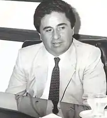 Democratic rule was restored in 1983, and Duhalde ran for mayor of Lomas de Zamora. Being a centrist, the PJ appointed him candidate as a compromise between the internal opposing factions. The elections ended in a technical tie with the candidate of the Radical Civic Union (UCR), Horacio Devoy; Duhalde won by just 700 votes. There was a tie in the elections for the local legislature as well, as both the PJ and UCR got eleven legislators.[4] Duhalde reported that a colonel sought his support for a possible coup against the newly elected president Raúl Alfonsín. Duhalde refused and reported directly to Alfonsín himself.[6][7] He was elected national deputy in 1987, and became vice president of the Argentine Chamber of Deputies. He established a commission to fight drug addiction during his term of office.[8]