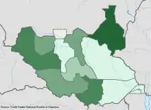 According to UNESCO, as of 2017, the number of illiterate individuals older than 15 constitutes more than 70 percent of the population in South Sudan.[5] The challenges are particularly severe for female children. According to the 2010 South Sudan Household Health Survey, the nationwide literacy rate for women remains to be 13.4 percent.[4] According to UNICEF, fewer than one percent of girls complete primary education. One in four students is a girl and South Sudan maintains the highest female illiteracy rate in the world.[6] It is estimated that more than one million of children eligible for primary school are not enrolled, with secondary school enrollment being even lower than 10% among those eligible.[4]