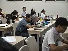 In practice, as technology has advanced, the particular "narrowly defined" terminological aspect that was initially emphasized by name has blended into the general field of educational technology.[15] Initially, "virtual learning" as narrowly defined in a semantic sense implied entering an environmental simulation within a virtual world, for example in treating posttraumatic stress disorder (PTSD).[16][17] In practice, a "virtual education course" refers to any instructional course in which all, or at least a significant portion, is delivered by the Internet. "Virtual" is used in that broader way to describe a course that is not taught in a classroom face-to-face but through a substitute mode that can conceptually be associated "virtually" with classroom teaching, which means that people do not have to go to the physical classroom to learn. Accordingly, virtual education refers to a form of distance learning in which course content is delivered by various methods such as course management applications, multimedia resources, and videoconferencing.[18] Virtual education and simulated learning opportunities, such as games or dissections, offer opportunities for students to connect classroom content to authentic situations.[19]