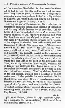 - The Journal of the (Pennsylvania) House of Representatives, 1826-1827, p.493-494, Report #218 "Report of the committee on claims, on the claim of Edward Hector, a revolutionary soldier. READ February 16, 1827 Mr. McCreery, from the committee on claims, to whom were referred the petition and documents of Edward Hector, made the following report, which was read, viz: That the petitioner states that he was employed in driving; an artillery waggon, attached to the regiment commanded by col. Proctor. That he was present at the battles of Brandywine and Germantown, and that he never received any compensation for his services. He therefore prays the Legislature to take his case into consideration, and grant him such relief as they may think proper. Your committee bed leave to remark, that there is no evidence before them, that anything is due to the petitioner; neither is there any testimony, except his own statement and deposition, how long he did serve, or what kind of service he rendered. There is the deposition of Thomas R. Brooks, stating that he was well acquainted with the petitioner, and knows that he was in the army; but does not say what length of time, nor in what capacity, he served. Your committee would further remark, that if the statements of the petitioner were fully substantiated, they would not consider him entitled to a pension, agreeably to the practice of the Legislature hitherto. They therefore offer the following resolution: Resolved, That the committee be discharged from any further consideration of the subject."