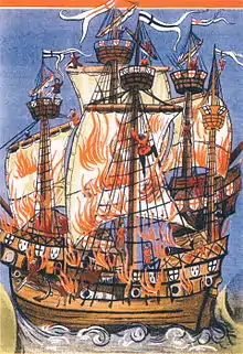 Between June and August 1511 Howard was paid over £600 to fit out ships for the conveying of "merchant aventurers", and both Holinshed and the Ballad of Andrew Barton record that in the course of these seafaring operations he and his brother Thomas captured the ships of the Scottish adventurer Andrew Barton.[2] Barton was sailing in his warship Lion and the small Jennet of Purwyn, (a captured Danish ship) with a Scottish royal Letter of Marque, which was a license to plunder Portuguese ships as a privateer. Both ships were captured and taken to Blackwall. Andrew Barton was killed during their capture.