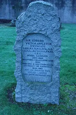 Sir Edward Victor Appleton GBE KCB FRS[3] (6 September 1892 – 21 April 1965) was an English physicist,[4][5] Nobel Prize winner (1947) and pioneer in radiophysics. He studied, and was also employed as a lab technician, at Bradford College from 1909 to 1911.