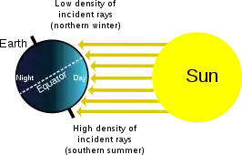 The amount of heat energy received at any location on the globe is a direct effect of Sun angle on climate, as the angle at which sunlight strikes Earth varies by location, time of day, and season due to Earth's orbit around the Sun and Earth's rotation around its tilted axis. Seasonal change in the angle of sunlight, caused by the tilt of Earth's axis, is the basic mechanism that results in warmer weather in summer than in winter.[1][2][3] Change in day length is another factor.[2][3] (See also season.)
