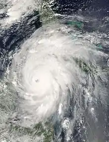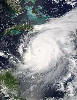![]() Satellite image of Hurricane Ivan passing south of Jamaica, its clouds covering the Greater Antilles | |