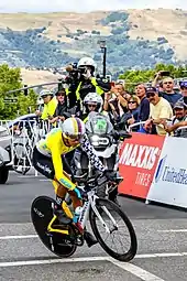 The following month, Bernal competed in the Tour de Romandie, winning stage three of the race, an individual time trial[21] and finishing second overall behind Primož Roglič. In May, Bernal achieved his first UCI World Tour win in the Tour of California, finishing over a minute ahead of Tejay van Garderen, and winning two stages.[22][23]