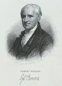 Egbert's oldest brother was Clerk of the New York State Senate, Robert Benson (1739–1823),[12] father of his namesake, Egbert Benson.[13]