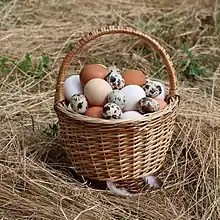 Eggs are laid by female animals of many different species, including birds, reptiles, amphibians, a few mammals, and fish, and many of these have been eaten by humans for thousands of years.[1] Bird and reptile eggs consist of a protective eggshell, albumen (egg white), and vitellus (egg yolk), contained within various thin membranes. The most commonly consumed eggs are chicken eggs. Other poultry eggs including those of duck and quail also are eaten. Fish eggs are called roe and caviar.