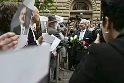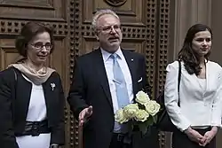 He was named a presidential candidate by the National Alliance party in 2011 and 2015,[13] coming second in votes in the final round to minister of defense Raimonds Vējonis in 2015.[14] Levits was widely discussed as a potential front runner candidate for the presidency in early 2019,[15] and on April 15 the parties of the ruling coalition announced that they would support Levits' candidacy.[16] Latvia's parliament elected him on 29 May 2019.[17]