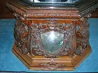 The glass case that covers the trophy has wooded framed sections and rises up from an ornately carved eight-sided wooden base emblazoned with four coats of arms, earls coronets, and with a silver engraved dedicatory shield. This base stands around 2 feet and 10 inches (85 cm) in height.[1] The dedicatory shield reads "Presented to Archibald, Earl of Eglinton, by the Visitors to the Eglinton Tournament held at Eglinton Castle. MDCCCXXXIX."