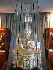 A second silver trophy was presented to the Earl by 300 citizens of Glasgow.[15] In 2014 a silver statuette measuring 44cm in height representing a knight in full armour with a jousting lance and a horse bearing the Earl of Eglinton's coat of arms was acquired by the East Ayrshire Leisure Trust on behalf of East Ayrshire Council. It is believed this is the only surviving part of the "second silver trophy" and that the rest of the candelabrum was melted down for its silver content after it was sold by the Earl of Eglinton in the 1920s.[16] The silver hallmark shows that the statuette dates to 1840, three years before the Eglinton Trophy was completed. The silversmiths were Benjamin Smith III of London and D.C.Rait of Glasgow.
