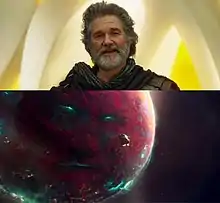 Ego appears in the live-action Marvel Cinematic Universe film Guardians of the Galaxy Vol. 2, portrayed by Kurt Russell.[36] This iteration is portrayed as being Peter Quill's biological father and claims to be a Celestial. After finding his son, he explains that he came into existence millions of years ago and learned to use his cosmic powers to manipulate matter and form an entire planet around himself as well as utilize many resources and a human body to interact with other sentient beings. After becoming bored of immortality and disappointed with a universe full of inferior life, Ego decided to remake all worlds in the universe into extensions of himself, a plan that required planted seedlings and the power of another Celestial to activate them. To achieve this, Ego mates with various species until a suitable offspring would be conceived to help put his plan into action. While Quill was the only one capable of helping him, the former rebelled against Ego after learning the latter had killed his mother. In the end, Quill and the Guardians of the Galaxy destroy Ego and foil his plan.