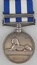 The Egypt Medal (1882–1889) was awarded for the military actions involving the British Army and Royal Navy during the 1882 Anglo-Egyptian War and in the Sudan between 1884 and 1889.