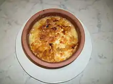 | Rozz me‘ammar | رز معمر | A rice dish made by adding milk (and frequently butter or cream) and chicken stock or broth to cooked rice and subsequently baking it in an oven. It is frequently substituted for plain white rice at festive occasions and large family meals. It is normally served in a special casserole made out of clay called bram. |