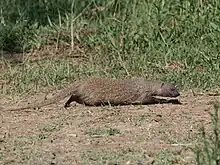 It preys on rodents, fish, birds, reptiles, amphibians, and insects. It also feeds on fruit and eggs. To crack eggs open, it throws them between its legs against a rock or wall.[2] In Doñana National Park, 30 Egyptian mongooses were radio-tracked in 1985 and their faeces collected. These samples contained remains of European rabbit (Oryctolagus cuniculus), sand lizards (Psammodromus), Iberian spadefoot toad (Pelobates cultripes), greater white-toothed shrew (Crocidura russula), three-toed skink (Chalcides chalcides), dabbling ducks (Anas), western cattle egret (Bubulcus ibis), wild boar (Sus scrofa) meat, Algerian mouse (Mus spretus) and rat species (Rattus).[26] Research in southeastern Nigeria revealed that it also feeds on giant pouched rats (Cricetomys), Temminck's mouse (Mus musculoides), Tullberg's soft-furred mouse (Praomys tulbergi), Nigerian shrew (Crocidura nigeriae), Hallowell's toad (Amietophrynus maculatus), African brown water snake (Afronatrix anoscopus), and Mabuya skinks.[27] It attacks and feeds on venomous snakes, and is resistant to the venom of Palestine viper (Daboia palaestinae), black desert cobra (Walterinnesia aegyptia) and black-necked spitting cobra (Naja nigricollis).[28]