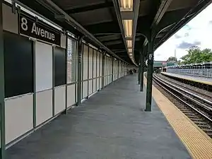 Eighth Avenue is the northernmost stop on the Sea Beach Line. West of this station, the tracks curve northward, enter a tunnel, and become the express tracks of the BMT Fourth Avenue Line.