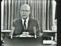 Eisenhower's farewell address (sometimes referred to as "Eisenhower's farewell address to the nation"[1]) was the final public speech of Dwight D. Eisenhower as the 34th President of the United States, delivered in a television broadcast on January 17, 1961. Perhaps best known for advocating that the nation guards against the potential influence of the military–industrial complex, a term he is credited with coining, the speech also expressed concerns about planning for the future and the dangers of massive spending, especially deficit spending, the prospect of the domination of science through Federal funding and, conversely, the domination of science-based public policy by what he called a "scientific-technological elite".[2] This speech and Eisenhower's Chance for Peace speech have been called the "bookends" of his administration.[3]