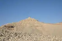 El Qorn (Arabic: القرن lit. "the horn"), is the highest point (420 m) in the Theban Hills, located on the western bank of the Nile, opposite Thebes, modern Luxor. Its ancient name was Ta Dehent, or "the peak." It has an almost pyramidal shape when viewed from the entrance to the Valley of the Kings, and it is for this reason that some Egyptologists believe the valley was chosen as the location of a royal necropolis.