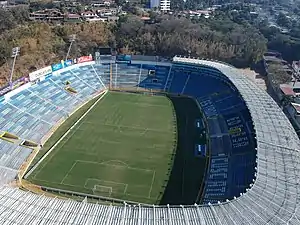 In 1969, EDESSA (Estadios Deportivos de El Salvador Sociedad Anónima) proposed the idea of a new national stadium.[80] This resulted in construction of the Estadio Cuscatlán, with the president of El Salvador, General Fidel Sánchez Hernández, breaking ground on 24 March 1971. The stadium held its first game on 24 July 1976, a friendly between El Salvador and the German Bundesliga champions, Borussia Mönchengladbach. It ended in a 2–0 victory to the German side. The Borussia squad featured players from their 1974 World Cup winning squad, including Berti Vogts, Rainer Bonhof, Wolfgang Kleff and Jupp Heynckes, alongside Allan Simonsen, who later won the 1977 Ballon d'Or and joined Barcelona. El Salvador's team was Tomás Pineda (Mauricio "Tarzán" Alvarenga), Guillermo "Billy" Rodríguez Bou, Ramón Fagoaga, Humberto "Imacasa" Recinos, Eduardo "Conejo" Valdés, Víctor "Pato" Valencia, Warner Solís, Félix "Garrobita" Pineda (César "Piscucha" Acevedo), Luis "Pelé" Ramírez Zapata (Abraham Coreas) & Ismael "Cisco" Díaz (David Cabrera). Borussia also fielded Wolfgang Kneib, Hans-Jürgen Wittkamp, Horst Wohlers, Dietmar Danner, Hans Klinkhammer, Carsten Nielsen and Uli Stielike.[81] Since that match, El Salvador has used the stadium for almost every major home game, and it is also the home ground of Alianza.[82] On 25 May 1978, EDESSA agreed to sign a 99-year lease of the stadium to CLIMA (Asociación de Clubes de Liga Mayor A) to operate and control which events are held there.[6]