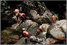 Its ecosystem is specifically surveyed by the Management Team of Ecosystems (Equipo de Manejos de Ecosistemas), which is led by Pedro Rios.[7] Due to its location in the northeastern part of Puerto Rico, the incoming trade winds from the Atlantic Ocean bash into the mountains, leading to an excess of rainfall registered at about 240 inches (6.1 m) per year.[7] This process is called orographic lift and accounts for the intense rainfall and constant cloud presence in this mountainous region. This constant cloud cover and persistent winds produced by the adiabatic process of air particles rushing up through the mountainside has affected the morphology of El Yunque, but the most effect has been on the bosque enano or dwarf forest.[8]
