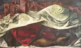 In the early 1950s there are other canvases that show nightmarish, contorted, bloody-looking images suggestive of slaughter, but unidentifiable bodies or body parts, somewhat in the manner of Francis Bacon. One painting shows a man with massive hands folded on his knees. Others, in a transitional stage of her work, are broken into planes, cubist-style. A painting from Mexico, which she says is the dead child of her maid, is a shadowy face, surrounded by leaves and swirls in deep shades of crimson.[10]