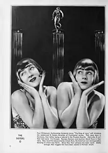 The sisters were born in Germany as Eleanor and Karla Knospe. Eleanor[1] and Karla[2] differed more than a year in age, but were often thought to be twins.[3] They were famous for performing together, for having bobbed haircuts, and for their dancing and acting skills.[4] They performed in several American films including King of Jazz (1930),[4][5] Recaptured Love (1930), and God's Gift to Women (1931).[1]