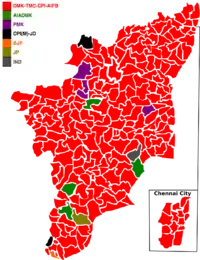 2019: The DMK-led UPA wins 37 of 38 seats, with the AIADMK-led NDA winning one seat. The election was cancelled in one seat (Vellore).
