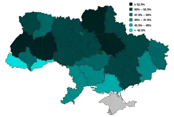 In the elections since 2002 voters of Western and Central Ukrainian oblasts voted mostly for parties (Our Ukraine, Batkivshchyna, UDAR, Self Reliance, Radical Party, Petro Poroshenko Bloc and the People's Front) and presidential candidates (Viktor Yuschenko, Yulia Tymoshenko) with a pro-Western and state reform platform, while voters in Southern and Eastern oblasts of Ukraine voted for parties (CPU, Party of Regions and Opposition Bloc) and presidential candidates (Viktor Yanukovych) with a pro-Russian and status quo platform.[22][23][24][25][26][27] Although this geographical division is decreasing.[28][22][29] Till the 2014 Ukrainian parliamentary election the electorate of CPU and Party of Regions was very loyal to them.[26] But in the 2014 parliamentary election Party of Regions did not to participate (because of a perceived lack of legitimacy (of the election), because not every resident of the Donbas could vote) and the CPU came 1.12% short of the 5% election threshold.[30][31] The results were a victory for the pro-Western parties and a major defeat for the pro-Russian camp.