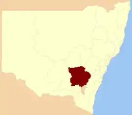 The 2004 redistribution of electoral districts estimated that the electoral district would have 47,688 electors on 29 April 2007.[1] At the 2007 election it encompassed almost all of Yass Valley Shire (including Yass, but excluding Sutton), all of the Upper Lachlan (including Crookwell and Gunning), Boorowa Council, Cowra Shire, a small part of Blayney Shire (including Mandurama and Lyndhurst), Weddin Shire (including Grenfell), a small part of Bland Shire, Young Shire, Harden Shire (including the twin towns of Harden and Murrumburrah), Cootamundra Shire, Gundagai Shire and part of Junee Shire (including Bethungra and Illabo).[2]