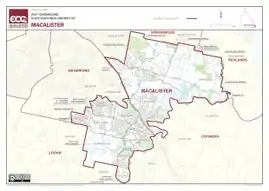 Located in Logan City, Macalister consists of the suburbs of Bahrs Scrub, Bannockburn, Beenleigh, Carbrook, Cornubia, Eagleby, Edens Landing, Holmview, Mount Warren Park, Windaroo, and parts of the suburbs of Loganholme and Waterford.[1]