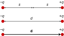 and is directed from the negative charge to the positive one. Some authors may split d in half and use s = d/2 since this quantity is the distance between either charge and the center of the dipole, leading to a factor of two in the definition.