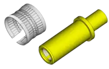 Crimped connectors are a type of solderless connection, using mechanical friction and uniform deformation to secure a connector to a pre-stripped wire (usually stranded).[1] Crimping is used in splice connectors, crimped multipin plugs and sockets, and crimped coaxial connectors. Crimping usually requires a specialised crimping tool, but the connectors are quick and easy to install and are a common alternative to solder connections or insulation displacement connectors. Effective crimp connections deform the metal of the connector past its yield point so that the compressed wire causes tension in the surrounding connector, and these forces counter each other to create a high degree of static friction. Due to the elastic element in crimped connections, they are highly resistant to vibration and thermal shock.[38]