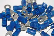 The connectors in the top row of the image are known as ring terminals and spade terminals (sometimes called fork or split ring terminals). Electrical contact is made by the flat surface of the ring or spade, while mechanically they are attached by passing a screw or bolt through them. The spade terminal form factor facilitates connections since the screw or bolt can be left partially screwed in as the spade terminal is removed or attached. Their sizes can be determined by the gauge of the conducting wire, and the interior and exterior diameters.