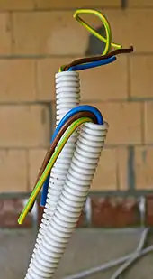 As of March 2011, the European Committee for Electrotechnical Standardization (CENELEC) requires the use of green/yellow colour cables as protective conductors, blue as neutral conductors and brown as single-phase conductors.[2]