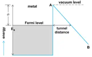 In field emission, electrons tunnel through a potential barrier, rather than escaping over it as in thermionic emission or photoemission.[43] For a metal at low temperature, the process can be understood in terms of the figure below. The metal can be considered a potential box, filled with electrons to the Fermi level (which lies below the vacuum level by several electron volts). The vacuum level represents the potential energy of an electron at rest outside the metal in the absence of an external field. In the presence of a strong electric field, the potential outside the metal will be deformed along the line AB, so that a triangular barrier is formed, through which electrons can tunnel. Electrons are extracted from the conduction band with a current density given by the Fowler−Nordheim equation