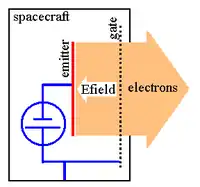 However, it is more difficult for the opposite (negative) end of the tether to eject free electrons or to collect positive ions from the plasma. It is plausible that, by using a very large collection area at one end of the tether, enough ions can be collected to permit significant current through the plasma. This was demonstrated during the Shuttle orbiter's TSS-1R mission, when the shuttle itself was used as a large plasma contactor to provide over an ampere of current. Improved methods include creating an electron emitter, such as a thermionic cathode, plasma cathode, plasma contactor, or field electron emission device. Since both ends of the tether are "open" to the surrounding plasma, electrons can flow out of one end of the tether while a corresponding flow of electrons enters the other end. In this fashion, the voltage that is electromagnetically induced within the tether can cause current to flow through the surrounding space environment, completing an electrical circuit through what appears to be, at first glance, an open circuit.