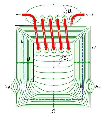 Since most of the magnetic field is confined within the outlines of the core loop, this allows a simplification of the mathematical analysis.[2] See the drawing at right. A common simplifying assumption satisfied by many electromagnets, which will be used in this section, is that the magnetic field strength B is constant around the magnetic circuit (within the core and air gaps) and zero outside it. Most of the magnetic field will be concentrated in the core material (C). Within the core the magnetic field (B) will be approximately uniform across any cross section, so if in addition the core has roughly constant area throughout its length, the field in the core will be constant.[2] This just leaves the air gaps (G), if any, between core sections. In the gaps the magnetic field lines are no longer confined by the core, so they 'bulge' out beyond the outlines of the core before curving back to enter the next piece of core material, reducing the field strength in the gap.[2] The bulges (BF) are called fringing fields.[2] However, as long as the length of the gap is smaller than the cross section dimensions of the core, the field in the gap will be approximately the same as in the core. In addition, some of the magnetic field lines (BL) will take 'short cuts' and not pass through the entire core circuit, and thus will not contribute to the force exerted by the magnet. This also includes field lines that encircle the wire windings but do not enter the core. This is called leakage flux. Therefore, the equations in this section are valid for electromagnets for which:
