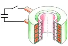 In practice the metal workpiece to be fabricated is placed in proximity to a heavily constructed coil of wire (called the work coil). A huge pulse of current is forced through the work coil by rapidly discharging a high-voltage capacitor bank using an ignitron or a spark gap as a switch. This creates a rapidly oscillating, ultrastrong electromagnetic field around the work coil.