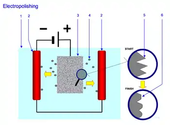 Electropolishing, also known as electrochemical polishing, anodic polishing, or electrolytic polishing (especially in the metallography field), is an electrochemical process that removes material from a metallic workpiece, reducing the surface roughness by levelling micro-peaks and valleys, improving the surface finish. It is used to polish, passivate, and deburr metal parts. It is often described as the reverse of electroplating.[1] It may be used in lieu of abrasive fine polishing in microstructural preparation.[2]