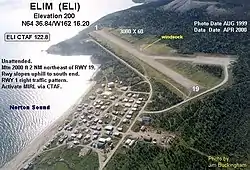 Elim Airport (IATA: ELI[3], ICAO: PFEL[4], FAA LID: ELI) is a state-owned, public-use airport located three nautical miles (6 km) southwest of the central business district of Elim,[1] a city in the Nome Census Area of the U.S. state of Alaska.