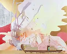 One painting can contain myriad spaces or timelines layered over one another: “Paintings hide beneath paintings in each painting. The surfaces build from stain to film to opacity. The imagery crosses from east to west coast, and east to west hemisphere, with the ease and speed of ideas.”[11]